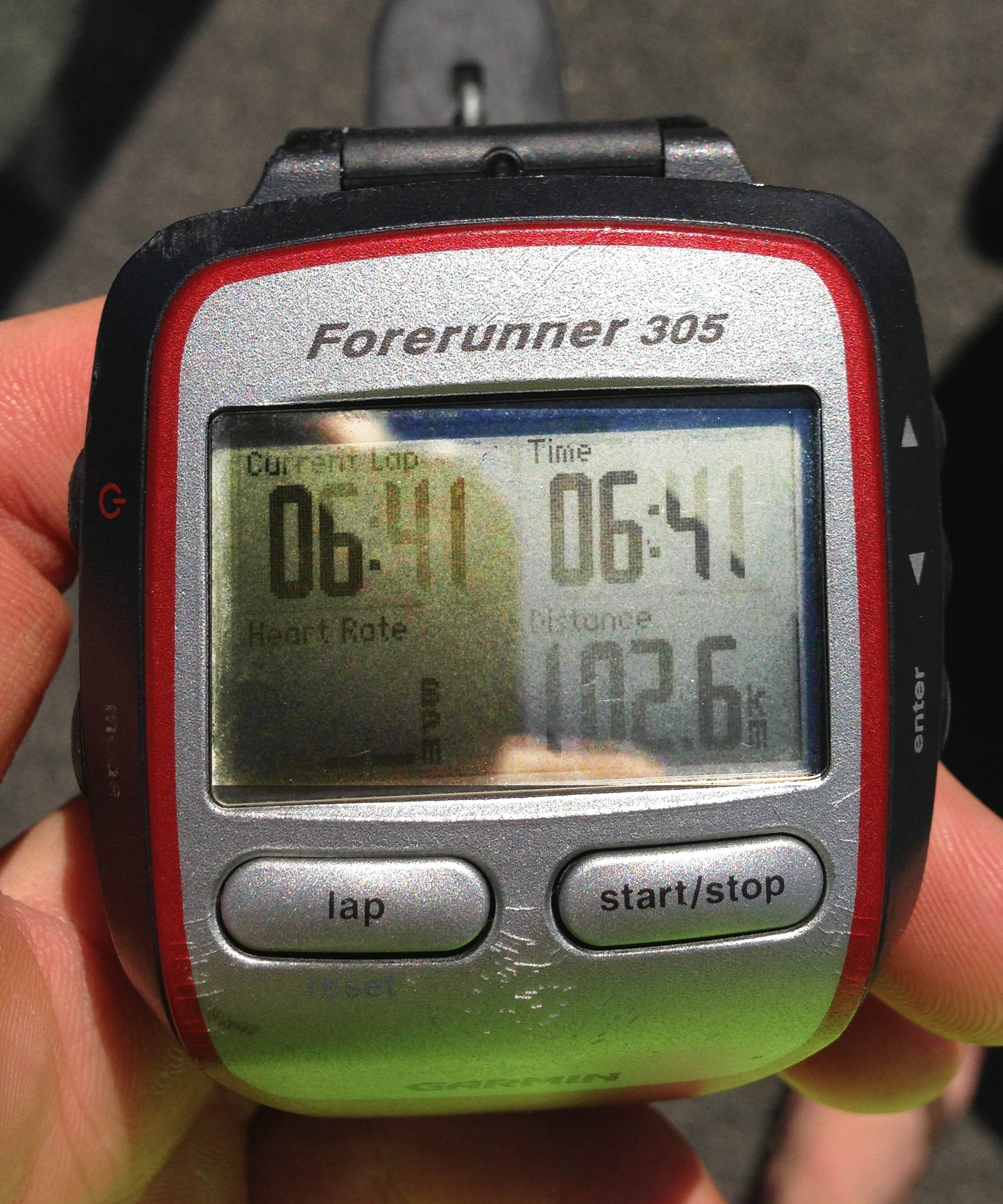 A photo of the final GPS reading: 102.6k in 6:41 (about 6 hours of “on” time if you take out the stops.