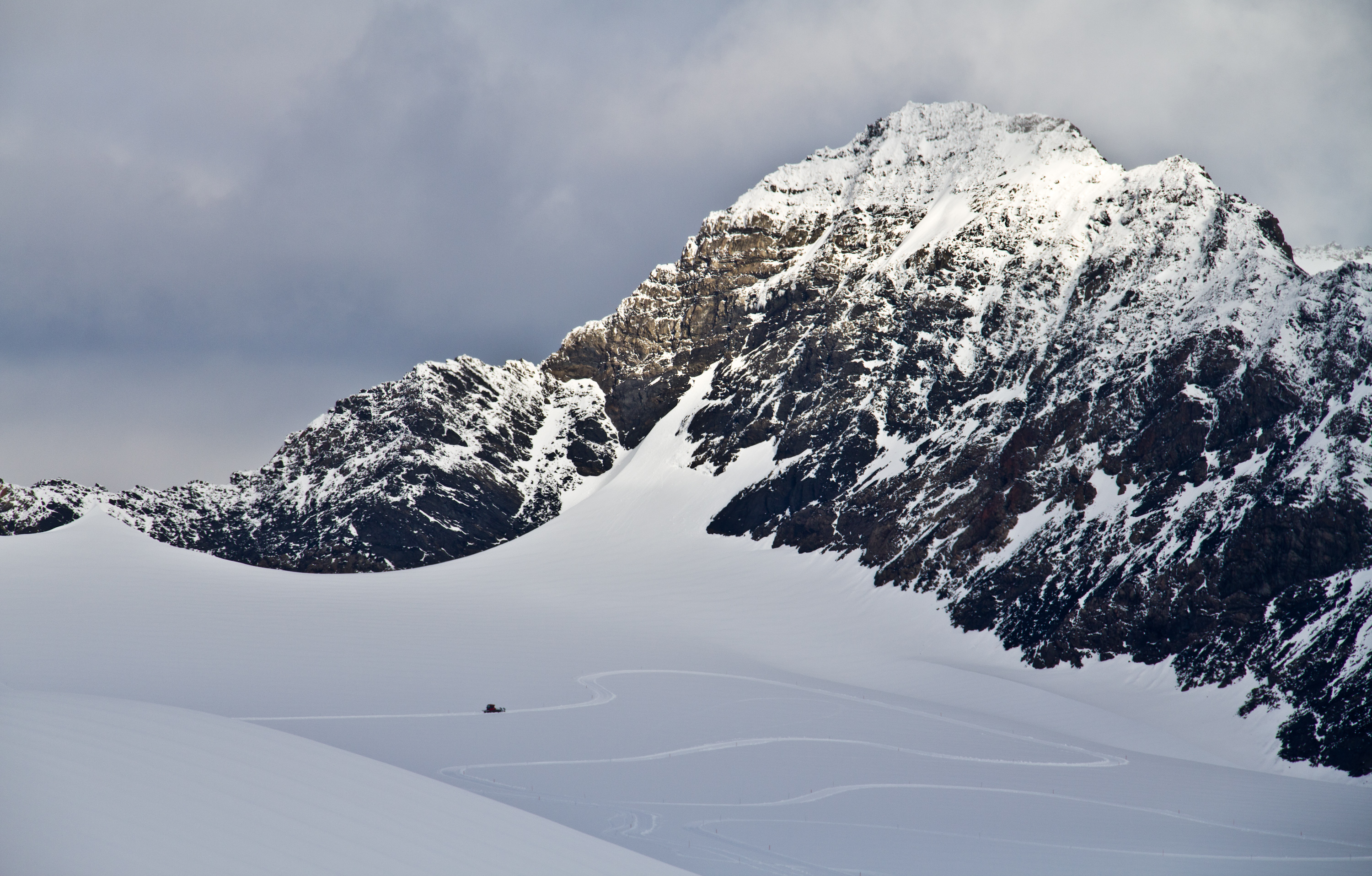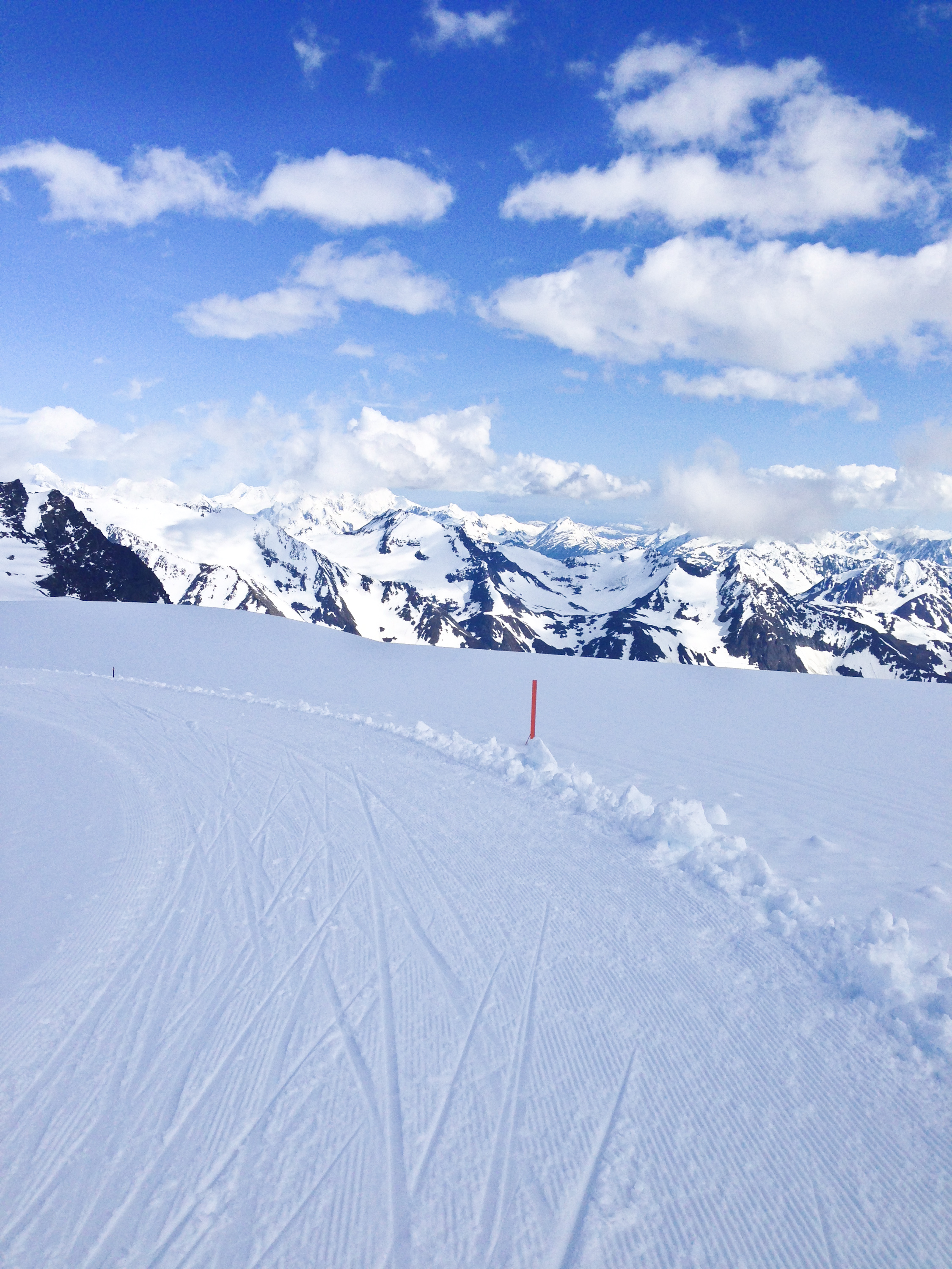 A 180 degree panorama. From left, the Thomas Training Center where we live on the glacier, the glacier itself and ski trails in the middle, and a skier at the start of the trail to the far right. All told there was close to 10k of groomed skiing.